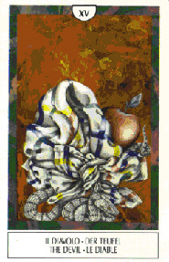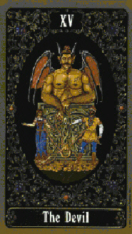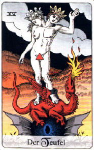 Der Teufel, der in seinem Geweih ein Stück Schale vom zerbrochenen Welten-Ei balanciert, sitzt gelassen unter der Sonne. Neben dem angeketteten Mann und Frau fällt hinter dem Teufel noch ein Pferdekopf auf, sowie ein Pflug. Das hinter diesem Pflug in der Erde steckende Schwert hat im Gegensatz zu den Teufelsschwertern in den anderen Tarot-Decks einen Griff. Der Teufel hält neben der Fackel auch eine brennende Kerze, die er in eine Schale stellt. Die Menschen, die man in einer kugeligen, stachligen Hülle erkennen kann, haben teils Tierköpfe, eine Amphore oder leuchtende Kugeln (Gestirne) als Kopf und Hände.