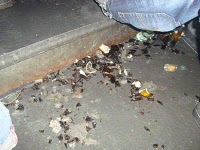 Flaschen und Gläser waren da zu Bruch gegangen und zertrampelt. Andauernd hatte ich im Profil meiner Rangers Scherben drin stecken. Es liefen sogar Leute mit Chucks hier rum: Das ist ja lebensgefährlich bei der Scherbenstrecke! Da kommen die Splitter doch irgendwann durch!