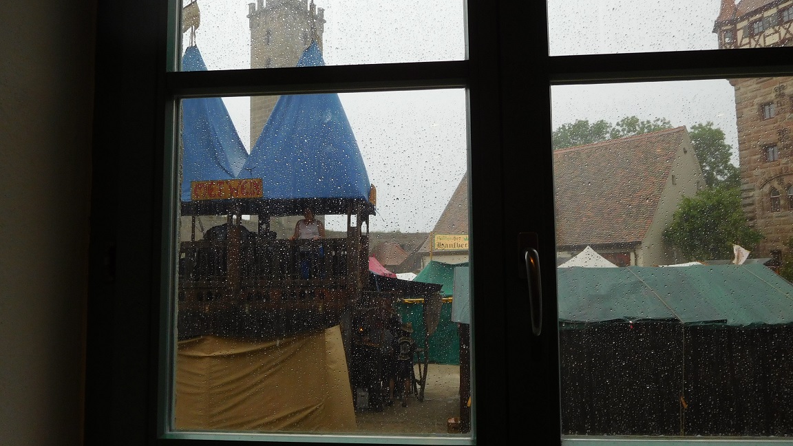 Weil es erst bei Rock am Ring oder irgendwo einen Unfall gegeben hatte und der Blitz irgendwie eingeschlagen war, hatten die Veranstalter hier richtig Angst und diese Angst legte sich über das ganze Festival. Es musste dann der Konzertplatz geräumt werden und die Leute sammelten sich im Burghof.
