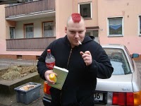 Es lief ganz gut an, nur gab es einen entscheidenden Haken: Das Bier kostete 3,90 + 1 € Pfand! Das ist ja obergesalzen für ne Punkerparty! Ino schmuggelte dann immer so 3 Flaschen vom eigenen Bier aus dem Auto in den Saal, aber der Kasten war bald leer. Da fuhren Ino und David an die Tankstelle, um Nachschub zu holen, aber da kostete das billigste Bier die Flasche auch 1,50! Das ist ja wohl voll der Wucher, hier in München!