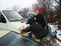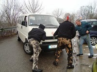 Wir versuchten es erst mal mit Anschieben, denn zum Glück standen wir ja an einem Hang. Die Jungs schoben ihre Karre aus dem Parkplatz, Hang abwärts. 2. Gang rein, kommen lassen (Mensch, Jungs, das könnt ihr doch, oder?) und schon sprang der Wagen an. Also weiter gings!