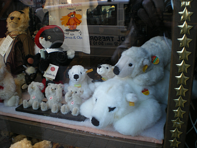 Das ganze Schaufenster von der Konditorei Beer in der Breiten Gasse ist voller Eisbären. Sie teilen sich jetzt - so kurz vor Ostern - den Auftritt mit den Osterhasen.