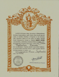 Der Bewahrer des Siegels des Altars des seligen Jakob von dieser ehrwürdigen apostolischen und metropolitanischen Kirche von Compostella macht, um allen Gläubigen und Pilgern, die aus der ganzen Welt im Gefühl der Ehrfurcht oder wegen eines Gelübdes an die Schwellen unseres Apostels, des Schutzherrn der spanischen Länder und des Beschützers, des heiligen Jakob, zusammenströmen, eine authentische Schrift zugänglich zu machen, (macht) allen und jedem Einzelnen, der die gegenwärtige (Schrift) betrachten wird, folgendes bekannt: dass Frau Rafa R. diesen allerheiligsten Tempel aus Frömmigkeit ehrfürchtig besucht hat. In deren (?) Schutz übertrage ich ihr (?) die gegenwärtige Schrift, bestätigt mit dem Siegel derselben heiligen Kirche. Gegeben (Datum) am 12. September 2006 Der für die Pilger zuständige Canonicus |