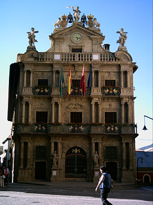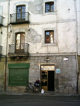 In Pamplona schob ich das Rad eine Weile. Die Altstadt fand ich recht schnell, nach lauter Hochhäusern und Industriegebiet. Da suchte ich rum nach einem Zimmer und traf eine Deutsche, auch auf der Suche nach einem Zimmer. Sie sagte, sie hat nun schon ein Zimmer reserviert für 42 Euro. Was? Oh no! Nee, echt nicht! Ich fuhr zur Touristen-Information, an der ich vorher vorbei gekommen war und fragte nach der Pilgerherberge. Es gab 2 hier und die Tussi – sie sprach Deutsch! – gab mir einen Stadtplan, wo sie einzeichnete, wo ich war und wohin ich musste. Ich fuhr da also hin und checkte mich in der Herberge ein, es war ein Kloster.