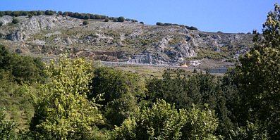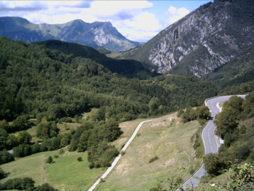 Nach dem Pass ging es wieder bergab. Ich erreichte eine Höchstgeschwindigkeit von 57 km/h. Ich fand ein Schild nach Lecumberri, da wollte ich hin. Aber kaum sah ich das Schild, war ich auch schon dort. Für diese Höhe und Abgeschiedenheit war das ein netter Ort. Der Ort hatte nur 1 Haken: Alle Schilder nach Pamplona wiesen auf die Autobahn! Am Ortsende fand ich ein weißes Pamplona-Schild und folgte dem, aber auch das führte auf die Autobahn. Zur Autobahn gings auch stark bergauf, so dass ich natürlich wieder schieben musste und nun durfte ich das alles wieder runter fahren. Der einzige Weg, der noch irgendwo anders hinführte, ging nach San Miguel, aber ich sah schon auf der Karte: der Weg führt ins Nichts, er hörte dann irgendwo einfach auf. Lieber fragen. Ich fragte ein paar Arbeiter und die versuchten mir dann zu erklären, dass es eine Landstraße gab, von der Autobahntankstelle aus. "Petrol" sagte der Mann und schlug gegen den hinteren Kotflügel seines Autos. Also fuhr/schob ich nochmal den Berg rauf zur Autopista.