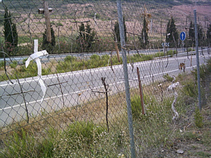| seltsame Nekrophilen-Sitte: in den Maschendrahtzaun eingewebte Todeszeichen aus Müll und Klopapier |