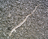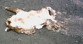 Kurz hinter, fast noch IN Leon, lag ein großer, toter Hund im Straßengraben. Der Kopf sah - bis auf die Augen – noch aus als ob er bloß schliefe, aber am Hinterbein war schon alles weg-verwest bis auf die blanken Knochen.