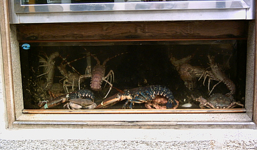 | Hummer und allerlei Todeskandidaten im Schaufenster vom Feinschmeckerlokal |
