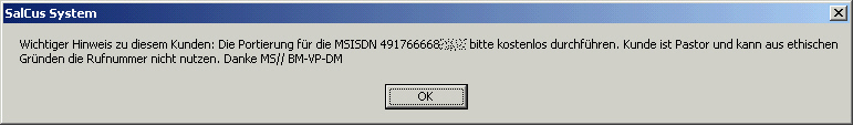 Die mir zugeteilten Rufnummern lauteten: 740 666 (Festnetz) und 0176 666 01xxx (mobil) Ich beantragte deshalb im Call Center eine Änderung zumindest der Mobil-Nummer, die mir auch genehmigt wurde. Leider konnte mir die Mitarbeiterin im Vorfeld nicht sagen, welche neue Rufnummer ich erhalten werde. Sie hatte auch keinen Einfluss eine derartige Zahlenreihe zu verhindert. Die per SMS zugesandte neue Rufnummer lautet nun 0176 666 03xxx. |