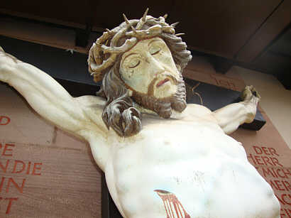 | Skulptur eines Hingerichteten in der Wolframs-Eschenbacher Kirche | vermutlich die gleiche Jammergestalt in einer Bamberger Kirche |