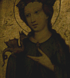 Bei meinen Streifzügen durch die Museen bin ich über die "heilige Margarethe" gestolpert: Sie ist eine der "14 Nothelfer" und lebte (angebl.) im 3. Jahrhundert. Da sie sich nicht mit dem römischen Stadthalter einlassen wollte, ließ dieser sie foltern und schließlich köpfen. Was dazu nun auch noch der Teufel bei dieser Hardcore-Liebesgeschichte zu suchen hatte, ist mir schleierhaft, aber auf jeden Fall erschien er ihr angeblich im Gefängnis - natürlich in Gestalt eines Drachen. Weil Margarethe sich erfolgreich gegen ihn behauptete, wurde sie dann enthauptet und das finden die Christen ganz toll und haben sie deswegen heilig gesprochen.
