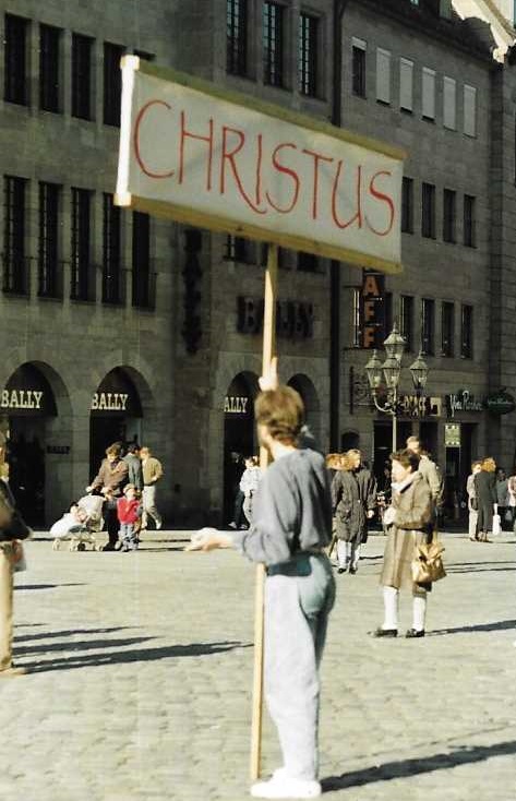 Eines sonnigen Oktobertages 1990 stellte sich der Christ Joachim mit seinem fetzigen, aus einem Bettlaken gebastelten Jesus-Schild vor die Lorenzkirche und begann alsbald zu predigen, als ihn dazu der Geist überkam. Unterdessen lief ich mit Aufnahmegerät durch die Leute, die dazu stehen geblieben waren, und fragte diese, wie die Aktion denn so rüberkam. Joachim dachte nämlich, welch himmlische Kraft aufgrund seiner Worte nun in den Zuhörern zur Wirkung käme und war dann auch selbst tief enttäuscht, als er die Cassette mit meinen Aufnahmen abhörte. Leider predigte er daraufhin nicht noch einmal - schade - es war doch so lustig!
